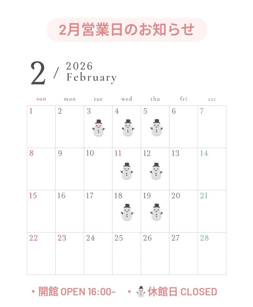 2月も休館日をいただきながら営業いたします。よろしくお願いいたします。